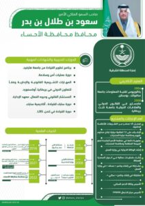 رفع صاحب السمو الملكي الأمير سعود بن طلال بن بدر محافظ الأحساء الشكر والعرفان لمقام خادم الحرمين الشريفين الملك سلمان بن عبدالعزيز “حفظه الله” على الثقة الملكية الكريمة بتعيينه محافظاً لمحافظة الأحساء.