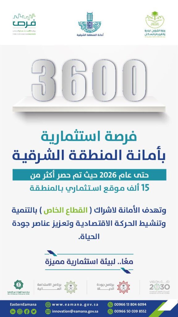 طرحت أمانة المنطقة الشرقية، أكثر من 250 فرصة استثمارية دائمة ومؤقتة للمستثمرين ورواد الأعمال في مختلف مدن ومحافظات المنطقة الشرقية، من إجمالي 400 فرصة تستهدفها الأمانة ضمن خطة الطرح حتى نهاية عام 2022م، وتهدف الأمانة إلى طرح أكثر من 3600 فرصة استثمارية حتى عام 2026م، عبر مجموعة من المحافظ الاستثمارية، حيث تبلغ المواقع الاستثمارية التي تم حصرها أكثر من 15 ألف موقع استثماري بأنشطة متعددة ومساحات مختلفة على الخارطة الاستثمارية للأمانة، وتأتي هذه الأعمال امتداداً لجهود الأمانة في تطوير منظومة الاستثمارات وتنمية الإيرادات وتعزيز عناصر جودة الحياة بالمنطقة تماشياً مع رؤية المملكة 2030 لإشراك القطاع الخاص بالتنمية وتحقيق مفهوم الاستدامة المالية وخصخصة الأعمال.