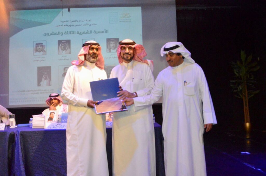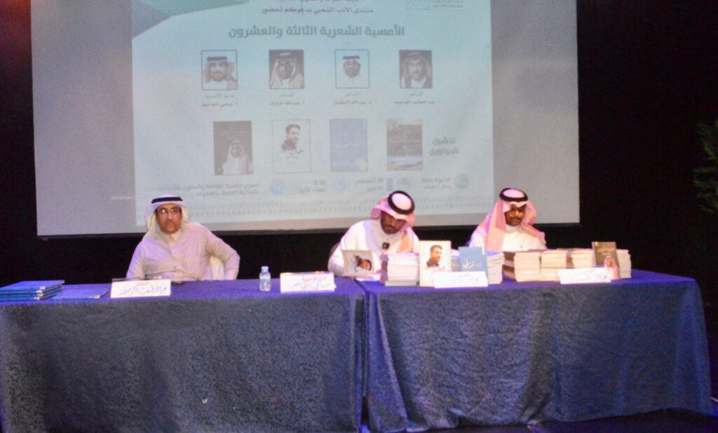 قدم منتدى الأدب الشعبي بجمعية الثقافة والفنون بالأحساء أمسيته الشعرية الثالثة والعشرون وذلك مساء يوم الأمس الأحد وشارك بها مجموعة من الشعراء وهم الشاعر عبداللطيف الوحيمد وتدشين ديوانه قصائدي في الاحساء و الدكتور عبدالله البطيان وتدشين ديوانه خذني الجمال الشعري و الشاعر عبدالله المبارك وتدشين ديوانه صوت الوتين والأمسية من تقديم الاعلامي سامي الجاسم ، وقد قدم المشاركين بالأمسية بعض قصائدهم والتي تفاعل معها الجمهور الحاضر و بعد ذلك تم تدشين الدواوين الشعرية و توزيعها على الحضور و بين مشرف لجنة التراث والفنون الشعبية بالجمعية رئيس منتدى الأدب الشعبي الشاعر راشد القناص أن المشاركين بالأمسية لهم اسهامات جليلة في خدمة الأدب الشعبي والتراث مقدما كل الشكر والتقدير لهم على تفاعلهم وحضورهم بالإضافة إلى جميع أعضاء المنتدى على جهودهم في إنجاح كل أمسيات المنتدى وهم كل من الإعلاميين سلطان النوه و عبداللّٰه العيد و سعد الشريدة وصالح اليعقوب وابراهيم الحمود وعلي الاحمد وبندر الخليفة والمصورين المبدعين ومحرري الصحف الورقية والالكترونية والشكر موصول للاخ صلاح العويشير على رعايته لهذه الامسية ، وقد بين مدير الجميعة يوسف الخميس بأن الاهتمام بالشعر والشعراء و الاحتفاء بمنجزهم هو أمر ضروري و نعدها من البرامج المهمة بالجمعية ولما لهم من جمهور عريض و اهتمام بالغ من المهتمين و أن القادم أكثر و أجمل.