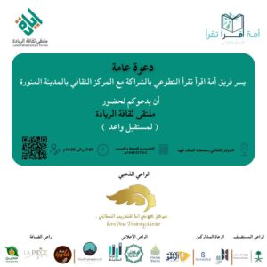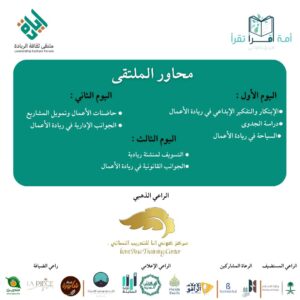 من باب الشراكة والخدمة المجتمعية نفذ فريق أمة اقرأ تقرأ التطوعي بالشراكة مع المركز الثقافي بالمدينة المنورة ملتقى ثقافة الريادة التطوعي والذي يضم نخبة من رجال ورواد الأعمال للحديث عن التطورات في مجال الريادة والابتكار وتوضيح دور كل من الجوانب الريادية القائمة من خلال لقاءات مع خبراء وجلسات إستشارية، وكان من اهداف هذا الملتقى هو نشر الإبداع والابتكار والتنوع في ريادة الأعمال، لبناء مجتمع معرفي ، وقد تضمن الملتقى عدة محاور لمدة ثلاث ايام متتالية ومن اهمها : دراسة الجدوى … الجوانب الإدارية وحاضنات الأعمال والتمويل للمشا يع ؟، والجوانب الإدارية في مجال الريادة ، وفي ختام الملتقى كُرم الراعي الذهبي مركز كوني أنا للتدريب النسائي والرعاية والمشاركين والمتطوعبن …