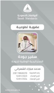 تم ترشيح الأستاذ محمد مبارك الشهراني ليكون سفيرا للجودة في العمل التطوعي في الهيئة السعودية للمواصفات والمقاييس والجودة للأعمال التطوعية