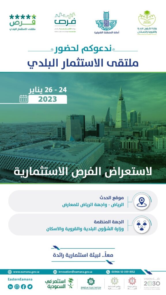 تشارك أمانة المنطقة الشرقية في ملتقى الاستثمار البلدي (فرص 2023) بنسخته الثانية، الذي تنظمه وزارة الشؤون البلدية والقروية والإسكان، بالرياض، خلال الفترة 24-26 يناير الجاري، ويحتضن أكثر من 5 آلاف فرصة استثمارية تناسب جميع شرائح المستثمرين بمختلف الأنشطة الاقتصادية، كما يتضمن جلسات حوارية يشارك فيها عدد من القيادات والمختصين والبراء، وورش عمل متخصصة.