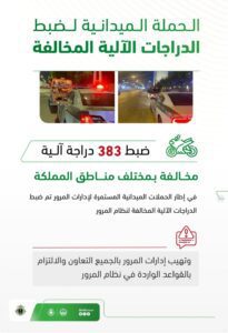 نجحت الحملة الميدانية للمرور السعودي لضبط الدراجات الآلية المخالفة، في ضبط 383 دراجة مخالفة بمختلف مناطق المملكة، وذلك في إطار الحملات الميدانية المستمرة التي تقوم بها إدارات المرور.