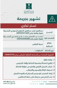 شهرت وزارة التجارة بعبدالعزيز ناصر عبدالعزيز المطوع سعودي الجنسية هوية وطنية رقم(XXXXXX1203)ومحمد عبدالمنعم محمد علي مصري الجنسية هوية مقيم رقم(XXXXXX5280)بعد صدور حكم قضائي يدينهما بارتكاب جريمة التستر في قطاع المقاولات بمدينة الرياض.