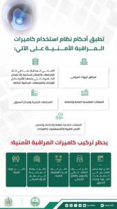 ووفق إنفوجرافيك توعوي نشره الدفاع المدني اليوم؛ هناك 5 مواقع يُحظر فيها تركيب كاميرات المراقبة الأمنية؛ منها غرف تبديل الملابس في المجمعات التجارية ومراكز التسوق، وغرف الكشف الطبي والتنويم والعلاج الطبيعي، وغرف العمليات الطبية، وداخل الوحدة السكنية في مرفق الإيواء السياحي، وداخل دورات المياه.