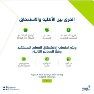 وقال البرنامج عبر حسابه في “تويتر”، إن الأهلية تعني شرط الجنسية السعودية للمستفيد الرئيسي، ومعيار الإقامة، وتوافُق البيانات مع الجهات ذات العلاقة.