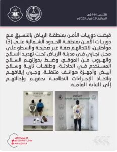 ألقت دوريات الأمن بمنطقة الرياض، بالتنسيق مع دوريات الأمن بمنطقة الحدود الشمالية، القبض على 3 مواطنين؛ لانتحالهم صفة غير صحيحة، والسطو على محل تجاري في مدينة الرياض تحت تهديد السلاح والهروب من الموقع.