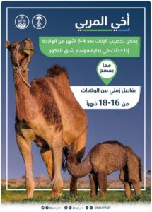 كشفت إدارة الإرشاد الزراعي بوزارة البيئة والمياه والزراعة عن إمكانية تخصيب إناث الإبل بعد 4 أو 5 أشهر من الولادة، إذا كانت في بداية موسم شبق الذكور.
