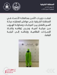 وتمّ توقيفه واتخاذ الإجراءات النظامية وإحالته إلى النيابة العامة.