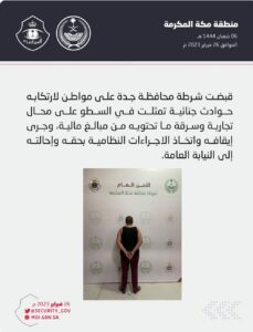 6 شعبان 1444 هـ - 26 فبراير 2023 م المشاهدات : 256 التعليقات: 0 جدة.. القبض على شخص لسطوه على محال تجارية وسرقتها https://ekhbareeat.com/?p=97378 صحيفة إخباريات متابعات قبضت شرطة محافظة جدة على مواطن؛ لارتكابه حوادث جنائية تمثلت في السطو على محال تجارية وسرقة ما تحتويه من مبالغ مالية. وقالت الشرطة جرى توقيفه واتخاذ الإجراءات النظامية بحقه وإحالته إلى النيابة العامة.