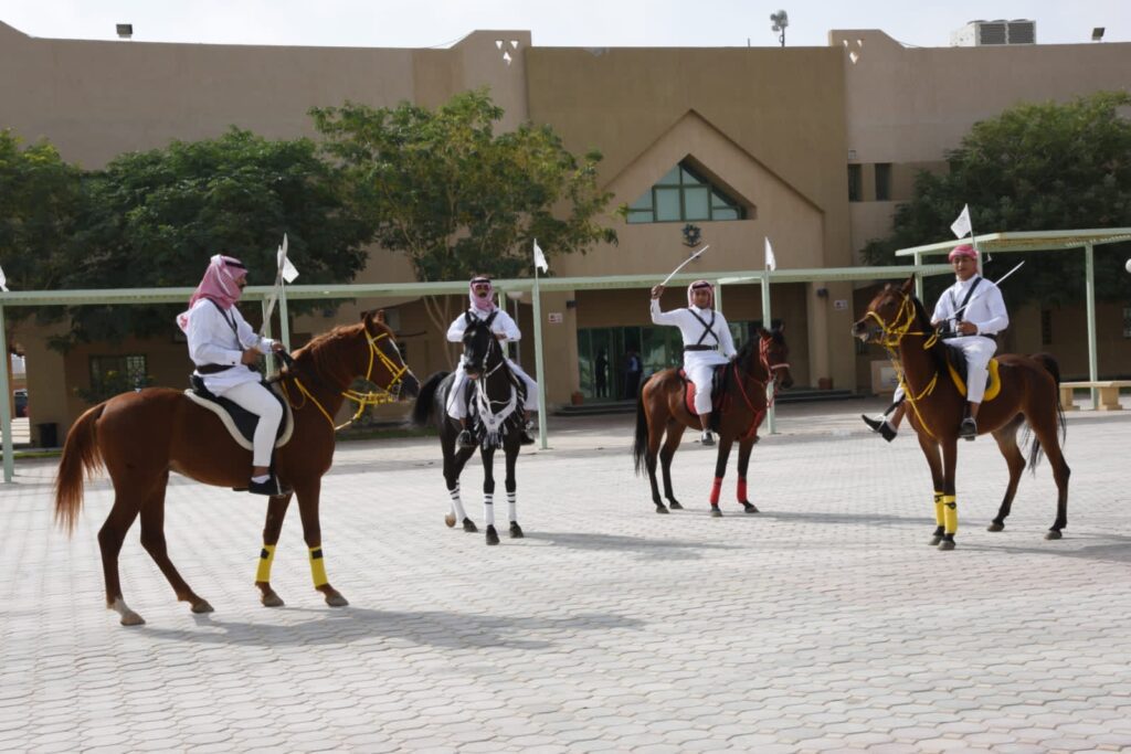وبدء الاحتفال برفع العلم السعودي من قبل جوالة الكلية ثم السلام الملكي ، بعده ألقى عميد الكلية عبدالله بن موسى الذكرالله كلمة أشار فيها بأنه في مثل هذا اليوم الذي يصادف 22 فبراير من كل عام يحتفل الوطن بيوم التأسيس الذي يرمز إلى العمق التاريخي والحضاري والثقافي لمملكتنا الغالية ، فيستحق أن نستذكر جميعاً تفاصيله ، فهو يعبر عن بداية تاريخ دولتنا وتعكس الجذور الراسخة لمملكتنا الممتدة لأكثر من (3) قرون ، وتأكيد على ارتباطنا الوثيق بقادتنا منذ عهد تأسيس الدولة السعودية في عام 1727م حتى العهد الميمون لخادم الحرمين الشريفين الملك سلمان بن عبدالعزيز آل سعود، وولي عهده الأمين صاحب السمو الملكي الأمير محمد بن سلمان – حفظهما الله.