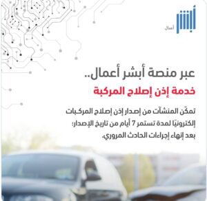 أوضح الأمن العام أن خدمة إذن إصلاح المركبة تمكّن المنشآت من إصدار إذن إصلاح المركبات إلكترونياً لمدة تستمر 7 أيام من تاريخ الإصدار، بعد إنهاء إجراءات الحادث المروري.