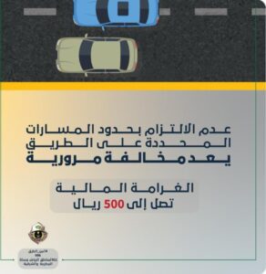 وأوضح أمن الطرق أن عدم الالتزام بهذه المسارات يعد مخالفة مرورية غرامتها قد تصل إلى 500 ريال.