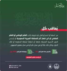 أكد الأمن العام أنه “يُعاقَب كل من أسقط أو أعدم أو أهان -بأي طريقة كانت- العَلَم الوطني أو العَلَم الملكي، أو أي شعار آخر للمملكة العربية السعودية أو إحدى الدول الأجنبية الصديقة، كراهة أو احتقارًا لسلطة الحكومة أو لتلك الدول، وكان ذلك علنًا أو في محل عام أو في محل مفتوح للجمهور”.